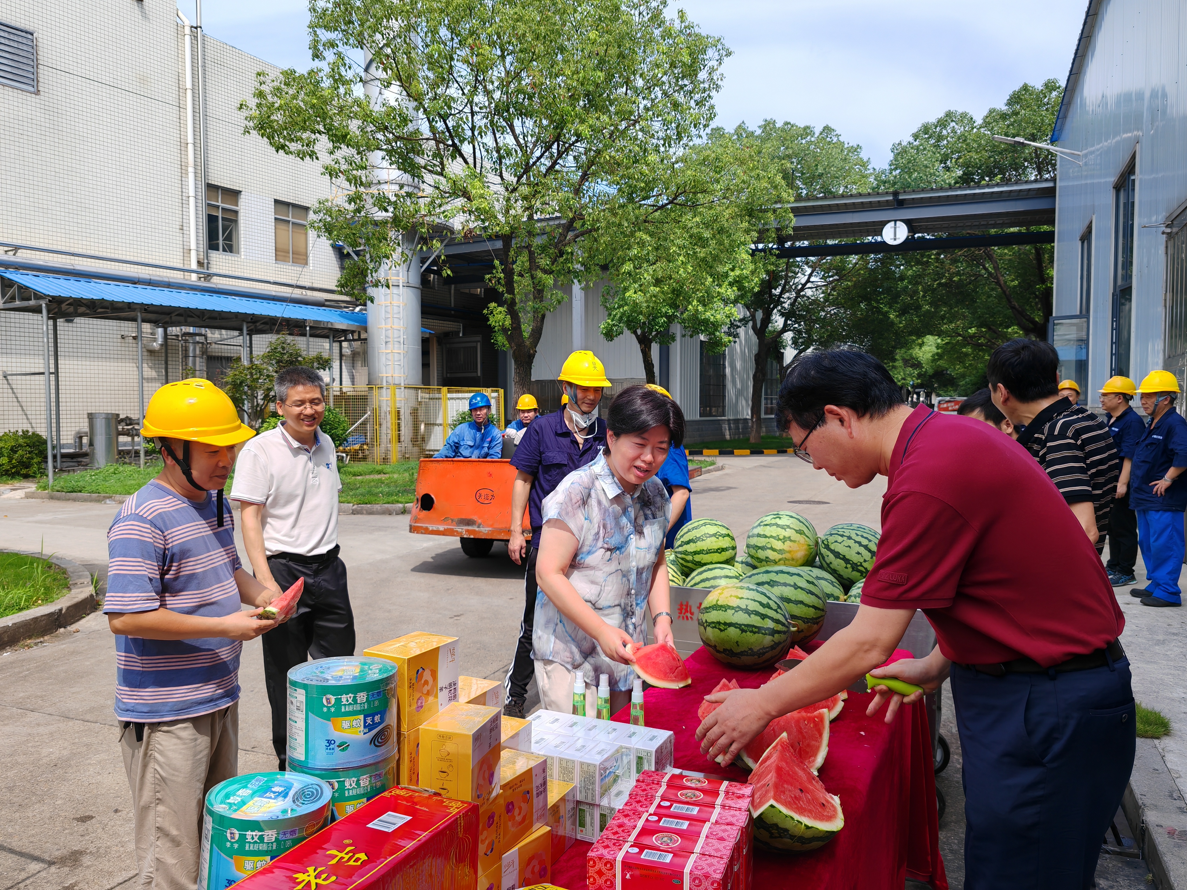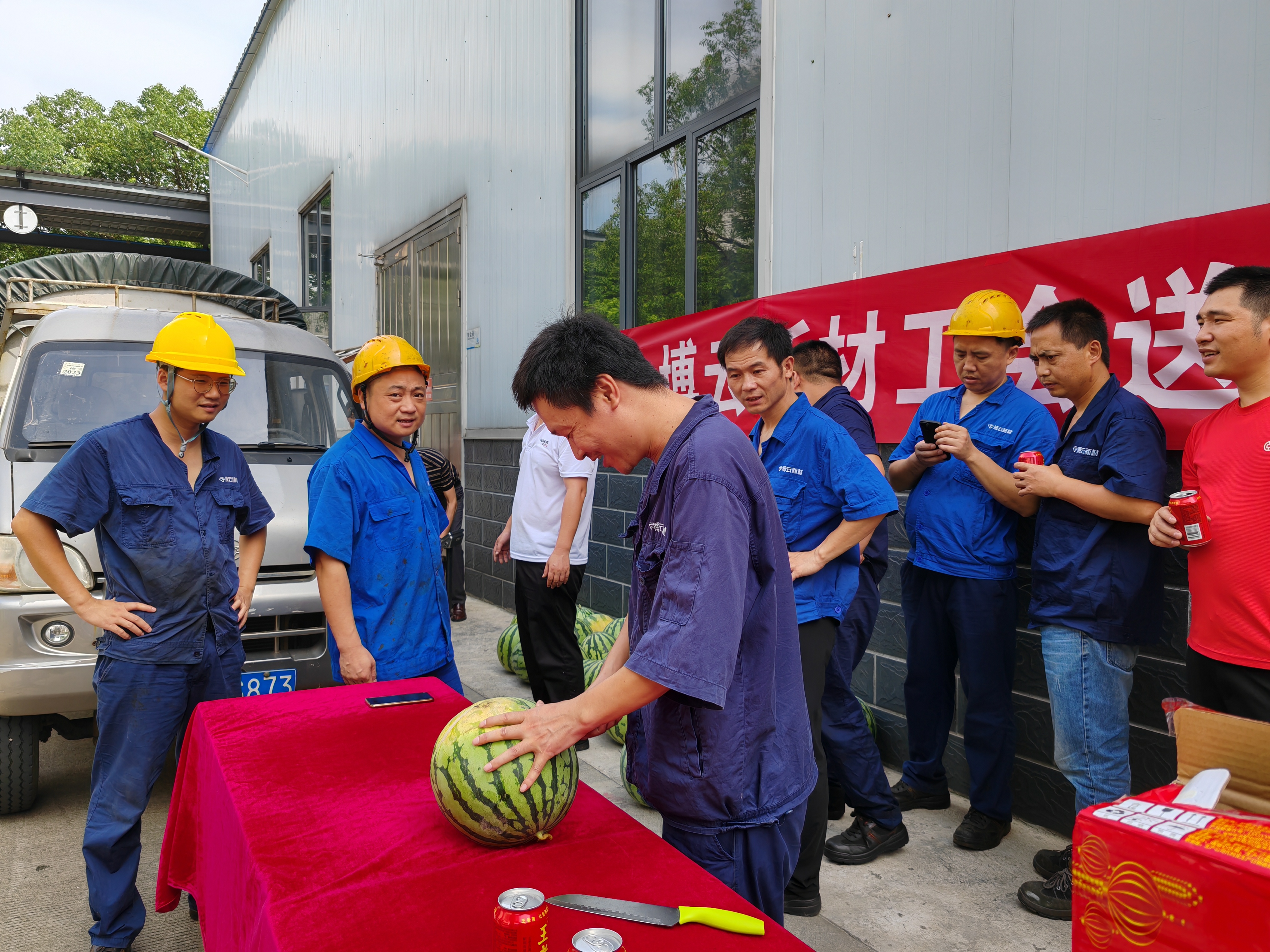 7月3日上午,常务副总裁蒋建湘、副总裁兼工会主席何国新、副总裁兼董秘曾光辉、财务总监严琦等公司领导,带着西瓜、王老吉、菊花枸杞决明子茶、清凉油等首批价值28000余元的防暑物资,向一线员工表达慰问。