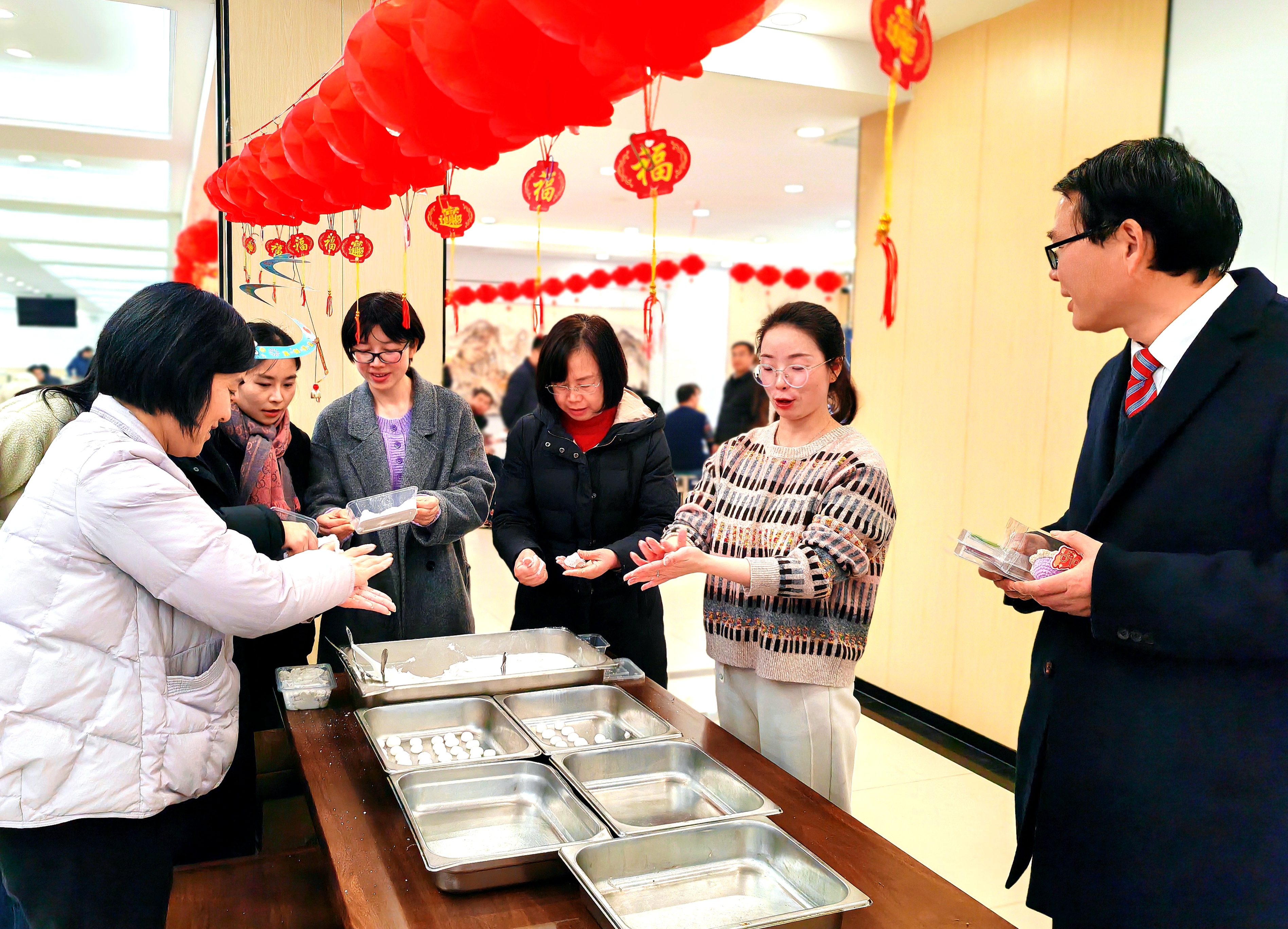 大红灯笼下,大家纷纷撸起袖子,揉面团、包馅料、搓汤圆,动作从生疏到熟练,不一会儿,一个个圆滚滚、白胖胖的汤圆就摆满了盘子。