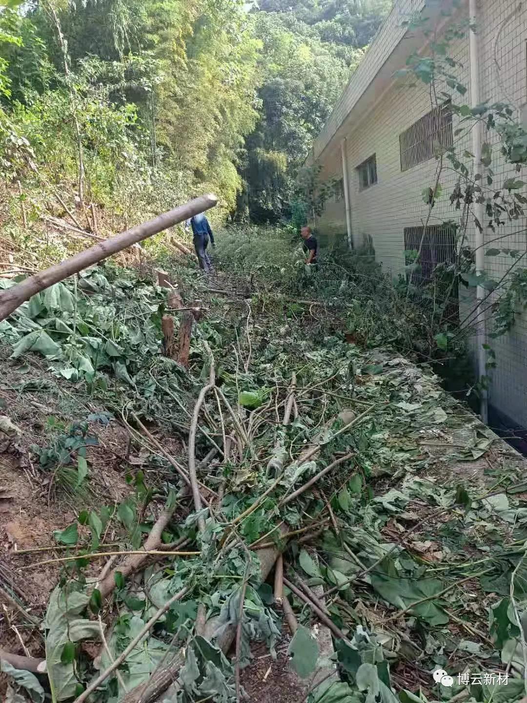 公司仓库后坡的树林过于茂盛,有的树枝已延伸至仓库屋顶,存在一定的隐患。想公司所想,急公司所急,综管部利用周末休息时间,牵头积极开展整改工作,清除外墙周围的树、灌木、杂草等其他障碍物。关桂香同志带领保安、保洁十余人一起开展复杂的清障工作。